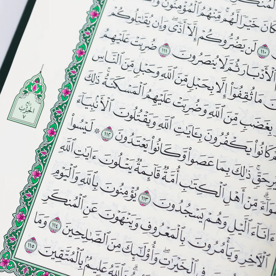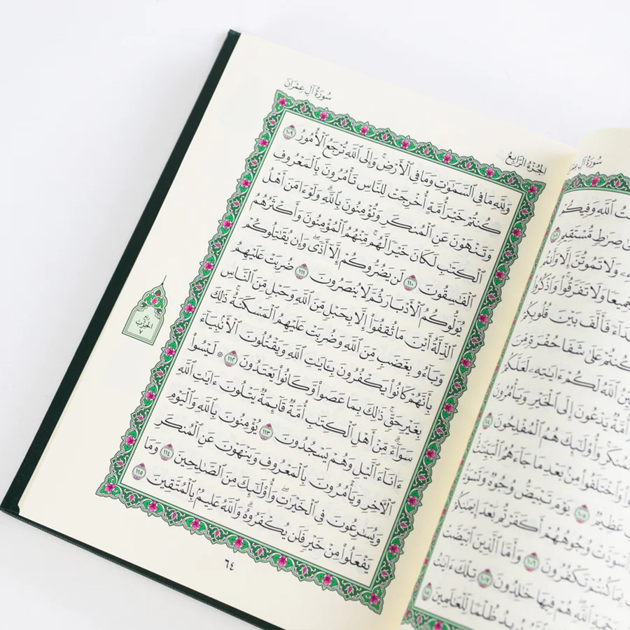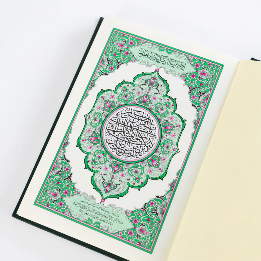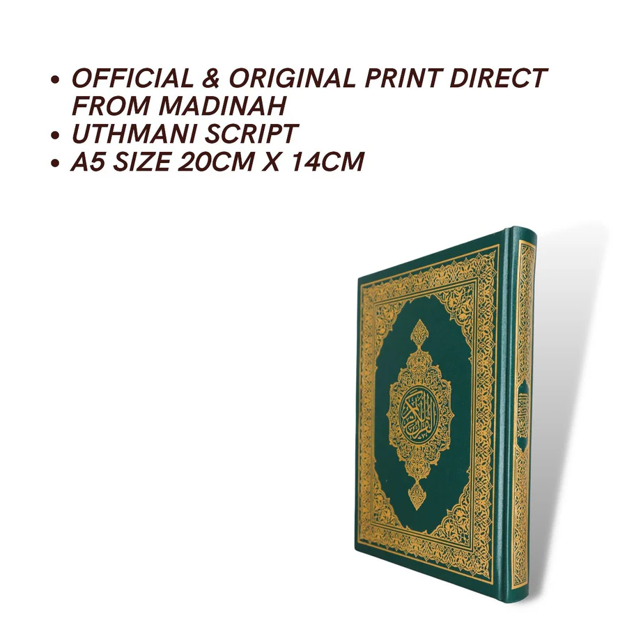 Brand New Official Madina Mushaf A5 (Uthmani Script) in elegant green cover, printed with clear and authentic Madinah script. Compact A5 size makes it easy to carry for daily recitation, travel, or mosque use. High-quality print with precise Arabic text for smooth and comfortable reading.