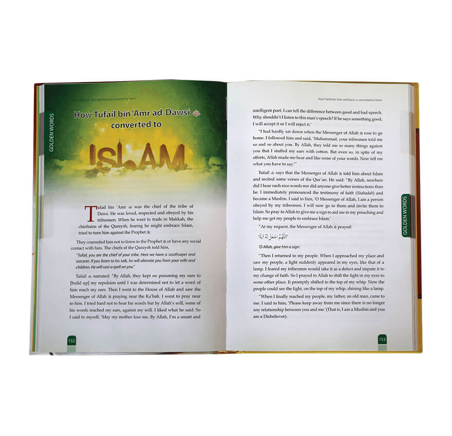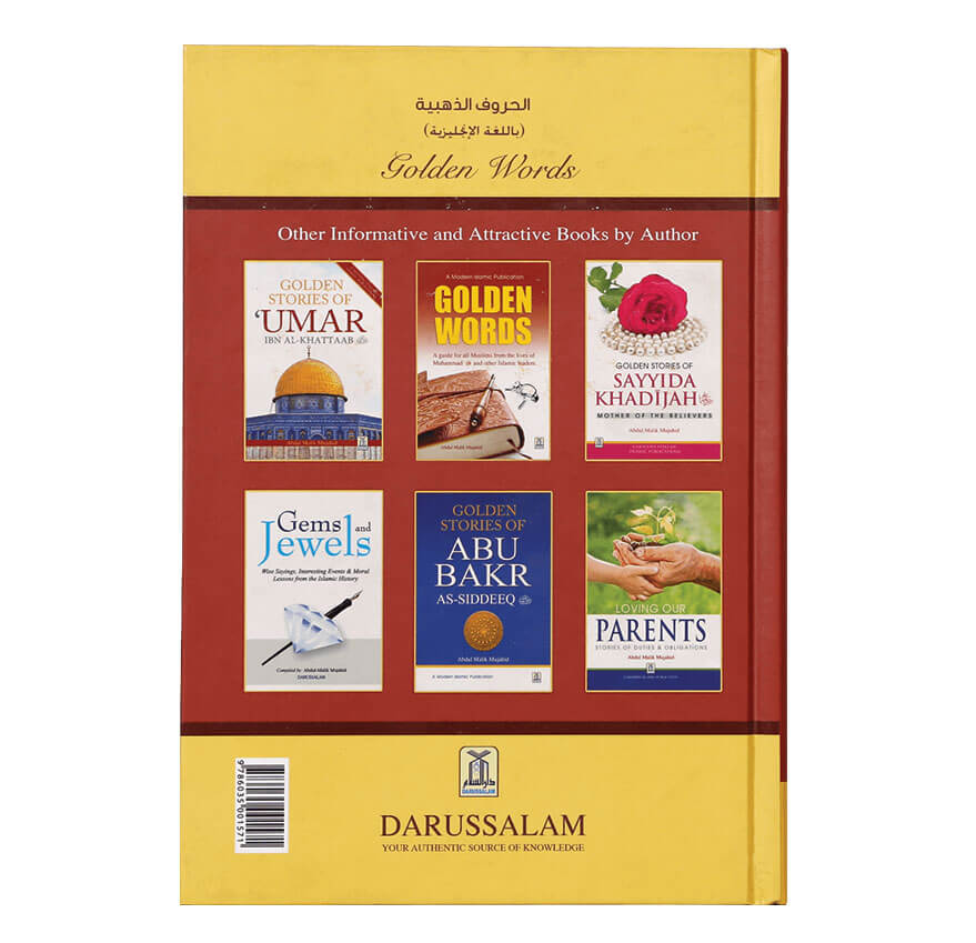 Golden Words a guide for all Muslims from the lives of Muhammad ﷺ and other Islamic leaders by Darussalam is a colorful book compiled by Mr. Abdul Malik Mujahid that tells instructive stories of Prophet Muhammad ﷺ and other prominent Islamic leaders to guide the readers to the right way. The powerful reminders delivered through the inspiring stories of pious people who dealt with their troubles offer life-altering lessons that can prove to be astutely beneficial to all readers. It features glimpses of Umar (RA) boldness, Ali’s (RA) last testament, mosques being outside king’s domain, Abu Bakr’s (RA) love for Allah’s Messenger, the blessings of Zam Zam, keys of success, conversion of an assassin to Islam by Prophet Muhammad ﷺ, the foresight of Abu Bakr (RA), the greatness of Ayesha (RA) and Yazeed’s proverbial generosity along with many others.