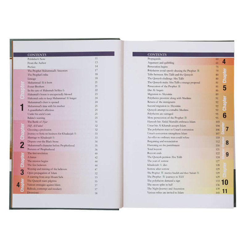 A beautifully presented hardback book containing colour photos. In depth factual information about the life and times of prophet Mohammed (pbuh). At the end of each chapter there are questions to help you refresh your memory about what you have just learned plus a section on lessons and morals. I love this book and highly recommend it.