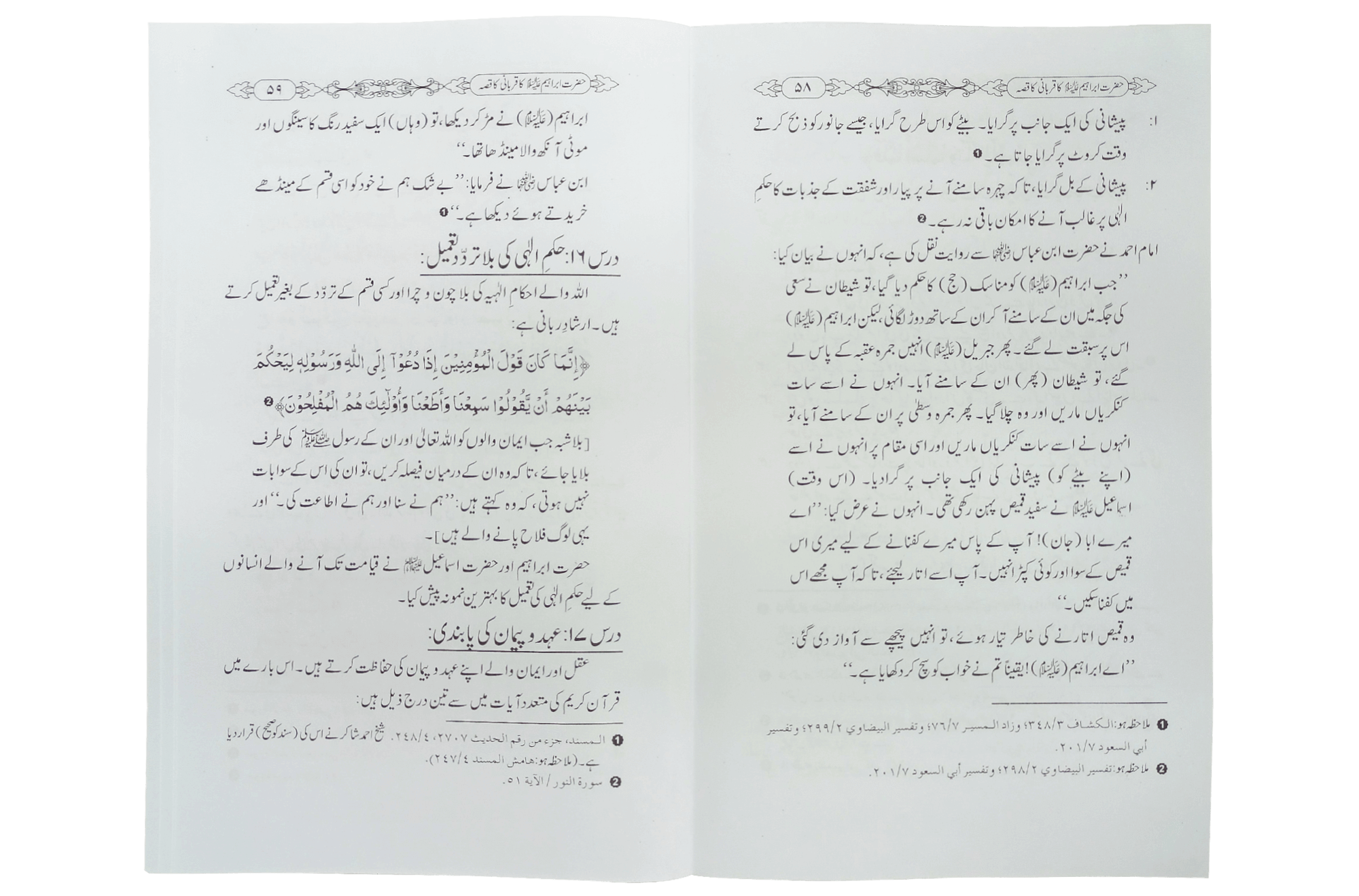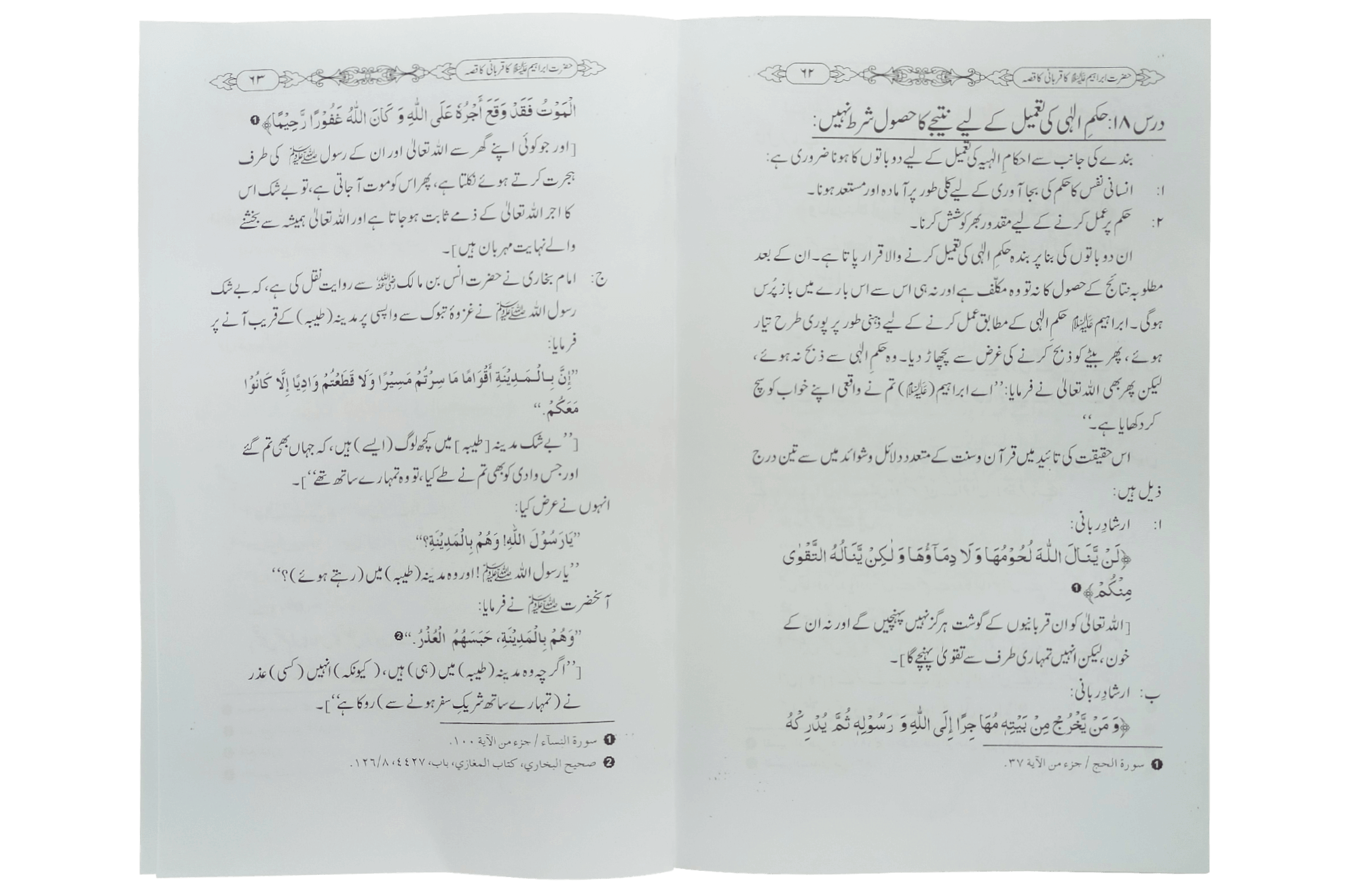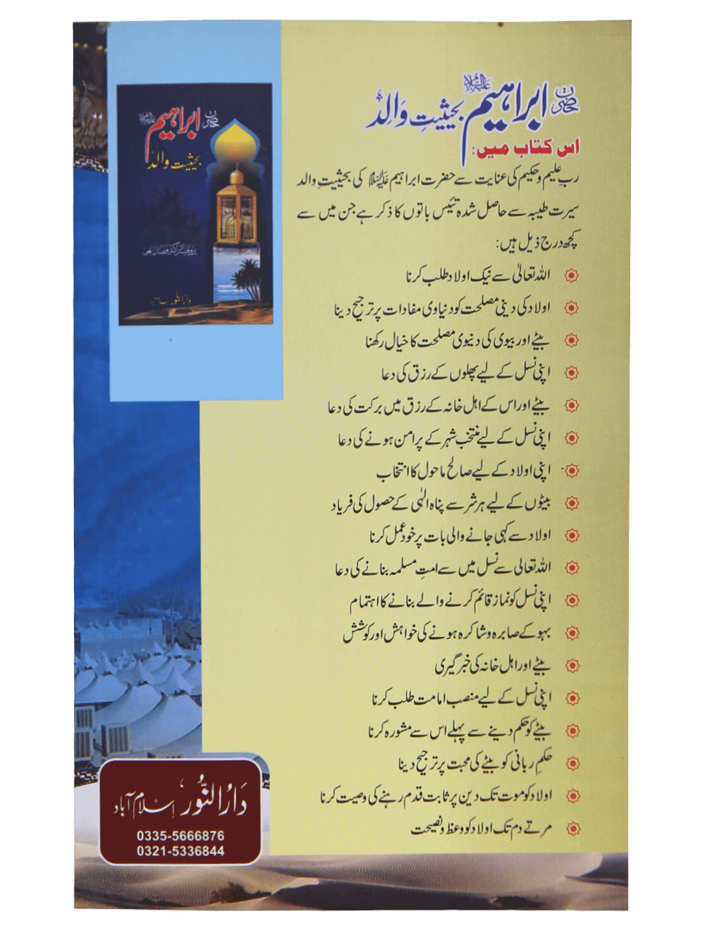اس کتاب میں رب علیم و حکیم کی عنایت سے حضرت ابراہیمؑ کی بحثیت والد سیرت طیبہ سے حاصل شدہ تیئس باتوں کا ذکر ہے- اللہ تعالی سے نیک اولا دطلب کرنا - اولاد کی دی مصلحت کو دنیاوی مفادات پر ترجیح دینا- بیٹے اور بیوی کی دنیوی مصلحت کا خیال رکھنا- اپنی نسل کے لیے پھلوں کے رزق کی دعا- بیٹے اور اس کے اہل خانہ کے رزق میں برکت کی دعا - اپنی نسل کے لیے منتخب شہر کے پرامن ہو نے کی دعا اپنی اولا د کے لیے صالح ما حول کا انتخاب بیٹوں کے لیے ہر شر سے پناوائی کے حصول کی فریادہے۔ اللہ تعالی سے نسل میں سے امت مسلمہ بنانے کی دعا ان نسل کو نماز قائم کرنے والے بنانے کا اہتمام بہو کے صابرہ وشاکرہ ہونے کی خواہش اور کوشش بیٹے اوراہل خانہ کی خبر گیری اپنی نسل کے لیے منصب امامت طلب کرنا بنے حکم دینے سے پہلے اس سے مشورہ کرنا حکم ربانی کو بیٹے کی محبت پر ترجیح دینا اولا دکوموت تک دین پر ثابت قدم رہنے کی وصیت کرنا مرتے دم تک ادا کرنا