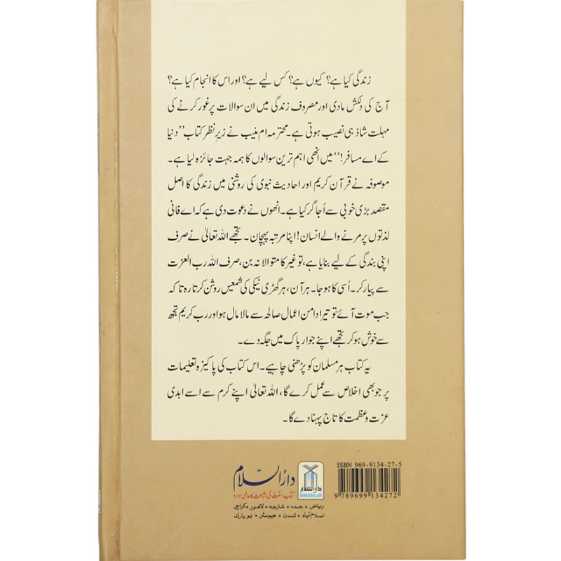 زندگی کیا ہے؟ کیوں ہے؟ کس لیے ہے؟ اور اس کا انجام کیا ہے؟ آج کی دلکش مادی اور مصروف زندگی میں ان سوالات پر غور کرنے کی مہلت شاذ ہی نصیب ہوتی ہے۔ محترم ام منیب نے زیرِ نظر کتاب `دنیا کے اے مسافر!` میں انھی اہم ترین سوالوں کا ہمہ جہت جائزہ لیا ہے۔ موصوفہ نے قران کریم اور احادیث نبوی کی روشنی میں زندگی کا اصل مقصد بڑی خوبی سے اُجاگر کیا ہے۔ انھوں نے دعوت دی ہے کہ اے فانی لذ توں پر مرنے والے انسان! اپنا مرتبہ پہچان۔ تجھے اللہ تعالیٰ نے صرف اپنی بندگی کے لیے بنایا ہے، تو غیر کا متوالا نہ بن ، صرف اللہ رب العزت سے پیار کر۔ اُسی کا ہو جا۔ ہر آن، ہر گھڑی نیکی کی شمعیں روشن کرتا رہ تا کہ جب موت آئے تو تیرا دامن اعمال صالحہ سے مالا مال ہوا اور رب کریم تجھ سے خوش ہو کر تجھے اپنے جوار پاک میں جگہ دے۔ یہ کتاب ہر مسلمان کو پڑھنی چاہیے۔ اس کتاب کی پاکیزہ تعلیمات پر جو بھی اخلاص سے عمل کرے گا، اللہ تعالیٰ اپنے کرم سے اسے ابدی عزت و عظمت کا تاج پہنا دے گا۔