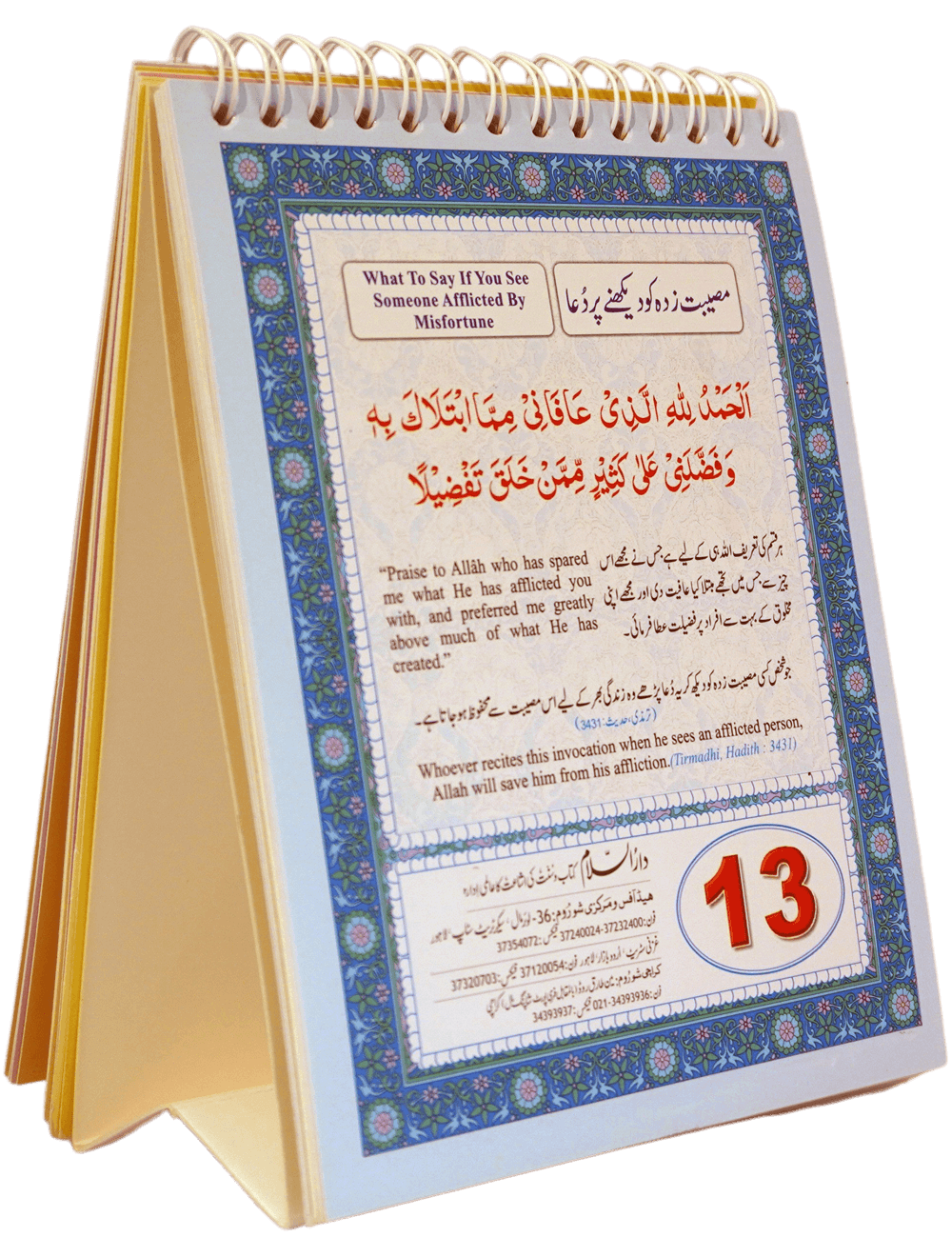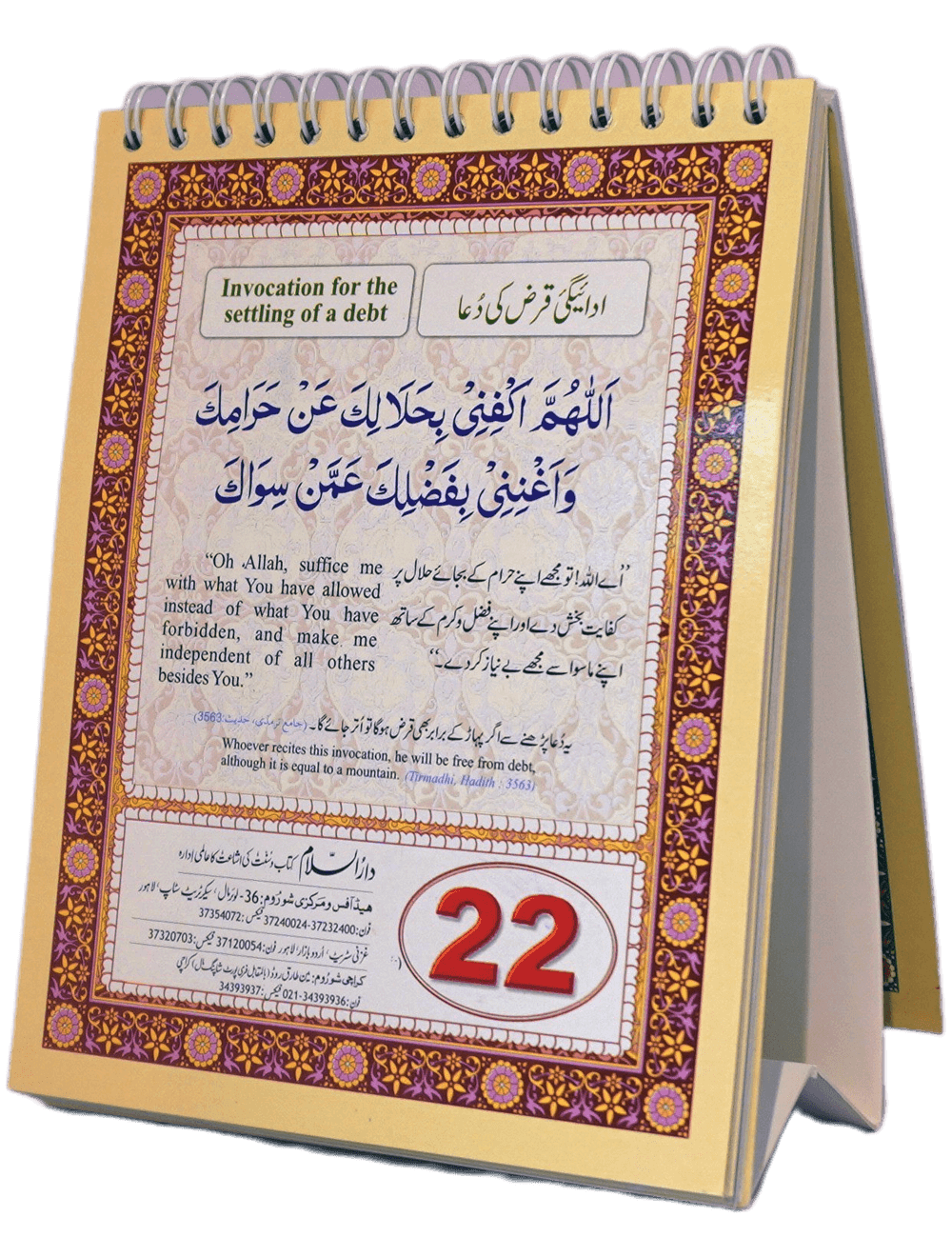 This beautiful Islamic Desk Calendar has 31 pages with beneficial supplications and their translations in English & Urdu. It includes Quran/hadith references and states the application method for the dua'. Each day flip the page and you will see another dua' on both side of the calendar. It will be very helpful for reciting and memorizing the invocations.