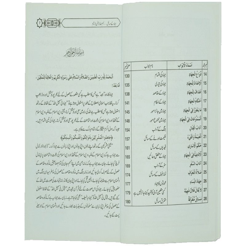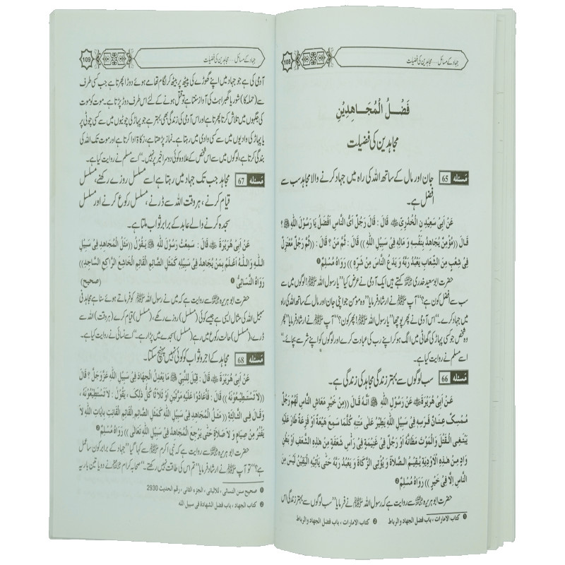 اس کتاب میں جہاد کی فرضیت، جہاد کی فضیلت، ترک جہاد کی مذمت، شہید کی فضیلت، اللہ کی راہ میں پہرہ دینے کی فضیلت، جہاد کے مقاصد، جہاد کے احکام، جہاد میں جائز امور اور ناجائز امور، جنگ کے آداب، غنیمت اور فے کے مسائل، قیدیوں کے مسائل اور نماز خوف کے مسائل پر احادیث صحیحہ کے حوالے سے روشنی ڈالی گئی ہے۔