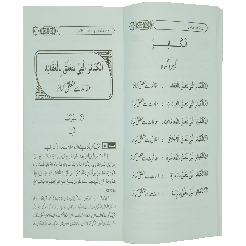 اس کتاب میں صغیرہ اور کبیرہ گناہ کی پہچان۔ صغیرہ گناہوں کا کفارہ، کبیرہ گناہوں سے توبہ کی وضاحت کی گئی ہے، نیز کبیرہ گناہوں کو 7 حصوں میں تقسیم کیا گیا ہے:1عقائد سے متعلق کبائر، مثلاً: شرک وغیرہ 2 عبادت سے متعلق کبائر، مثلاً: ترکِ نماز 3 اخلاق سے متعلق کبائر،مثلاً: جھوٹ وغیرہ 4 معاملات سے متعلق کبائر، مثلاً: سود وغیرہ 5 معاشرے سے متعلق کبائر، مثلاً: ناحق قتل وغیرہ 6 حکمرانی سے متعلق کبائر، مثلاً: حکمرانوں کا رعا یا پر ظلم کرنا 7 زینت سے متعلق کبائر، مثلاً: تصویر وغیرہ کے بارہ میں احادیث صحیحہ کے حوالے سے روشنی ڈالی گئی ہے۔