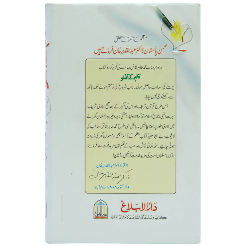 اللہ تعالی نے انسان کی فطرت ہی کچھ ایسی بنائی ہےکہ قصے، واقعات اور داستانیں اس پر فورا اثر انداز ہوتی ہیں جبکہ فلسفیانہ موشگافیاں ہزاروں میں سے چند ایک کی طبیعت کو تو راس آ سکتی ہیں لیکن عام انسان کے طبیعت وفطرت عموما اس سے گریزاں ہی رہتی ہے۔یہی وجہ ہے کہ اللہ تعالی نے انسان کی اس فطرت کو سامنے رکھتے ہوئےقرآن مجید میں بے شمار قصے اور واقعات بیان کئے ہیں۔نبی کریم ﷺنے اپنے فرمودات میں پہلی قوموں کے متعدد واقعات بیان کئے ہیں۔ان سچے قصوں کا فائدہ یہ ہوتا ہے کہ انسان اچھے کردار کو اپنانے کی کوشش کرتا ہے اور برے کردار سے اپنے آپ کو بچاتا ہے۔زیر تبصرہ کتاب" قلم کے آنسو " جماعت الدعوہ پاکستان کے مرکزی رہنما اور پاکستان کے معروف کالم نگار محترم جناب طاہر نقاش صاحب کی کاوش ہے، جس میں انہوں نے جماعت کے ہفتہ وار چھپنے والے اخبار غزوہ میں تعاقب کے نام سے چھپنے والے اپنے کالمز کو ایک جگہ جمع فرما دیا ہے۔