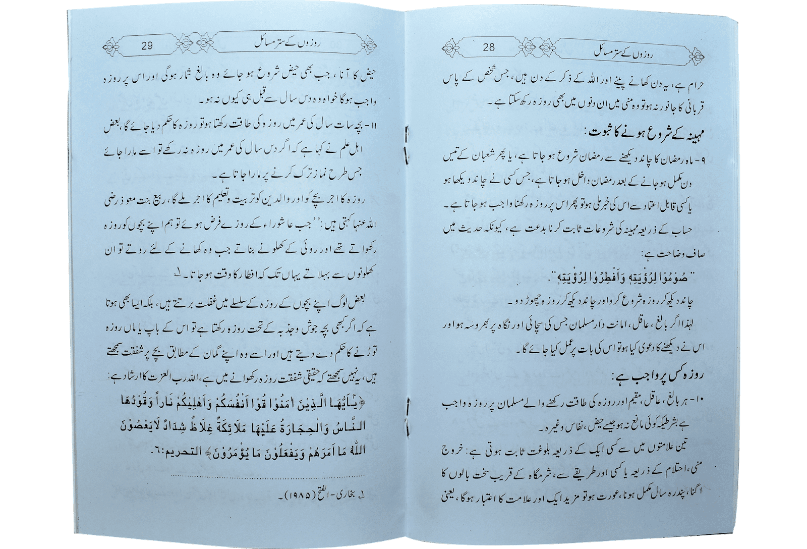 یہ رسالہ روزہ کے مختصر احکام پر مشتمل ہے جس میں اسکے آداب وسنن کا مختصراذکر ہے،چونکہ اس عبادات کی شان بڑی عظیم ہے،اس کے احکام کا سیکھنا بھی ضروری ہے،تاکہ مسلمان کو واجب چیزوں کا علم ہواور وہ اسے بجالاسکے،حرام کا پتہ ہو جس کی بناء پر اس سے بچ سکے اور مباحات کی خبر ہو تاکہ خود سے محروم کرکے مشقت میں مبتلا نہ کر لے۔