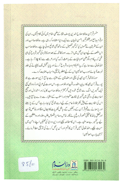 سورۂ فاتحہ قرآن مجید کی پہلی اور مضامین کے اعتبار سے جامع ترین سورۃ ہے جو پورے قرآن مجید کا مقدمہ ،تمہید اور خلاصہ ہے ۔ اس سورۃ کی عربی اور اردو میں کئی ایک تفسیریں الگ سے شائع ہوچکی ہیں۔ زیر تبصرہ تفسیر سورۂ فاتحہ مفسر قرآن حافظ صلاح الدین یوسف﷾ کی اس سورت کی تفصیلی تفسیر ہے ۔ حافظ صاحب کی مرقوم جامع اور مختصر تفسیر ’’احسن البیان‘‘ کے قبول عام پر حافظ صاحب کے مقربین نے محسوس کیا کہ انہیں قرآن مجید کی ایک تفصیلی تفسیر بھی لکھنی چاہیے تو حافظ صاحب نے سورۂ فاتحہ کے بعد سورۂ بقرہ کی تفسیر شروع کی ہی تھی کہ یہ کام دیگر علمی مصروفیات کے باعث رک گیا۔اللہ تعالیٰ حافظ صاحب کواسے پایۂ تکمیل تک پہنچانے کی توفیق واسباب عنایت کردے ۔(آمین)حافظ صاحب نے سورۃ الفاتحہ کے تفسیر ی نکات صحیح احادیث کی روشنی میں شرح وبسط کےساتھ بیان کیے ہیں۔ ان کا استدلال بہت دلنشیں ہے ۔یہ تفسیر اس تفسیر سورۃ الفاتحہ سے الگ ایک نئی تفسیر ہے جو تفسیر’’ احسن البیان ‘‘ میں شامل ہے یہ تفسیرخاص وعام بالخصوص طلبہ ،علماء اور واعظین کےلیے بے حد مفید ہے