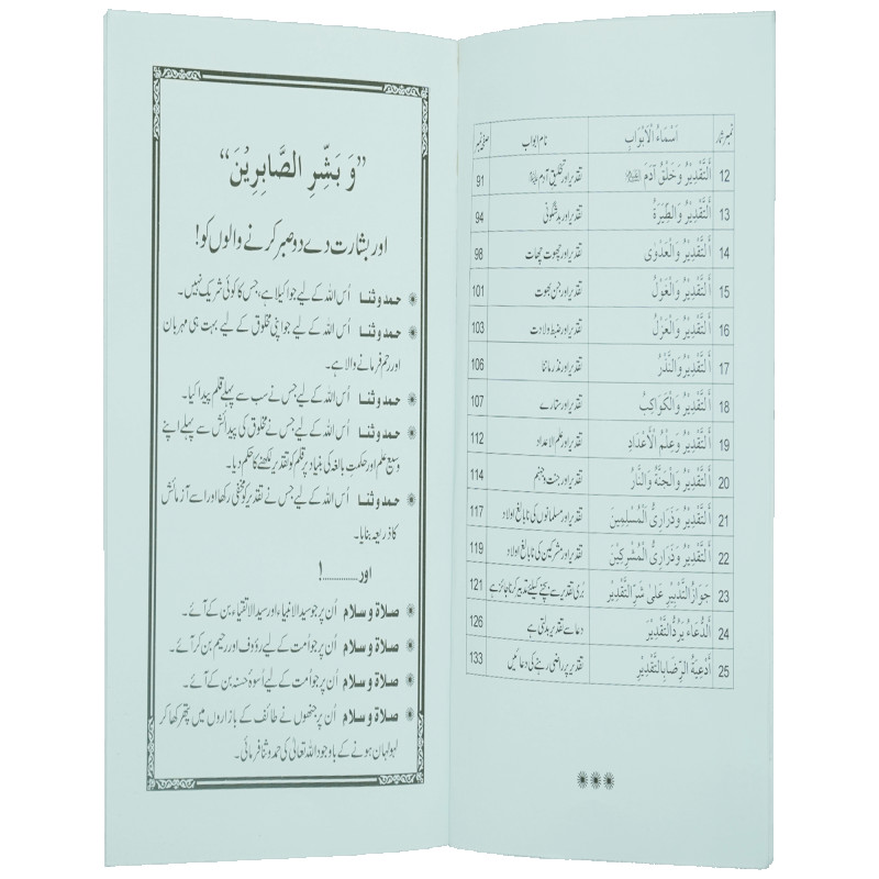 اس کتاب میں تقدیر پر ایمان لانے کا وجوب اور اس کی فضیلت، منکرین تقدیر کے بارے میں شریعت کا حکم، تقدیر پر بحث کی ممانعت کا حکم، نیز چھوت چھات، علم نجوم، علم الاعداد، ضبط ولادت، نذر اور بدشگونی وغیرہ کے علاوہ جنت اور جہنم کے بارے میں تقدیر کے مسائل اور احکام واضح کیے گئے ہیں۔