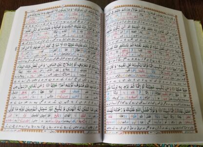 ۔دوسری اور تیسری سطر لفظی ترجمے کی ہے،یہاں الفاظ کو گرامر کی رو سے اسم، فعل ، حرف اور اسم ضمیرکیلئے متعین رنگ دیا گیا ہے جس کی وضاحت ہر صفحے کے نیچے بائیں جانب ایک بکس میںکی گئی ہے۔یہ رنگ عربی متن اور لفظی ترجمے دونوں کو دیا گیا ہے تاکہ مرکب لفظ کی صورت میں اصل لفظ یا صیغےکا ترجمہ واضح ہو جائے۔