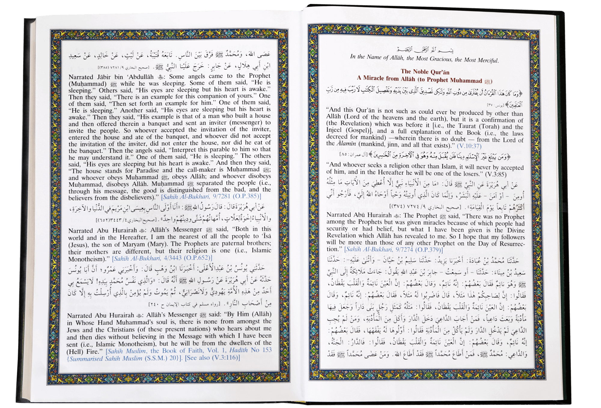 The Noble Qur`an is a widely popular translation by Islamic University Madina scholars Dr. Muhsin Khan and Dr. Taqi-ud-Din Hilali. It features frequent footnotes gleaned by the translators from Tafsir At-Tabari, Tafsir Ibn Kathir, and Sahih-al-Bukhari. Arabic-English format with the detailed index.