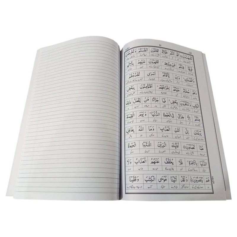 White Urdu Translation Para Set Juz 1-30 By Al Huda Publications. this is very interested. Arabic text is translated by hand under each word with extra space below for students to write notes.